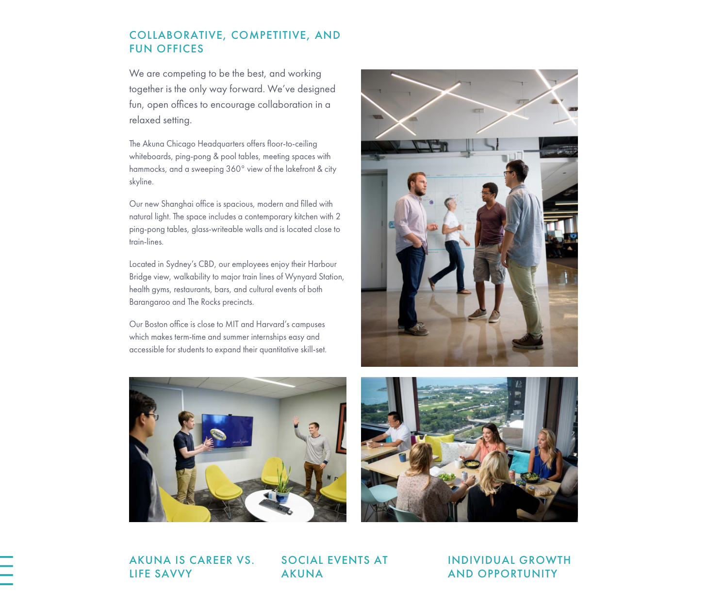 The Finished Product: A focused and targeted website full of engaging photos that positions Akuna Capital to strategic partners and new recruits.